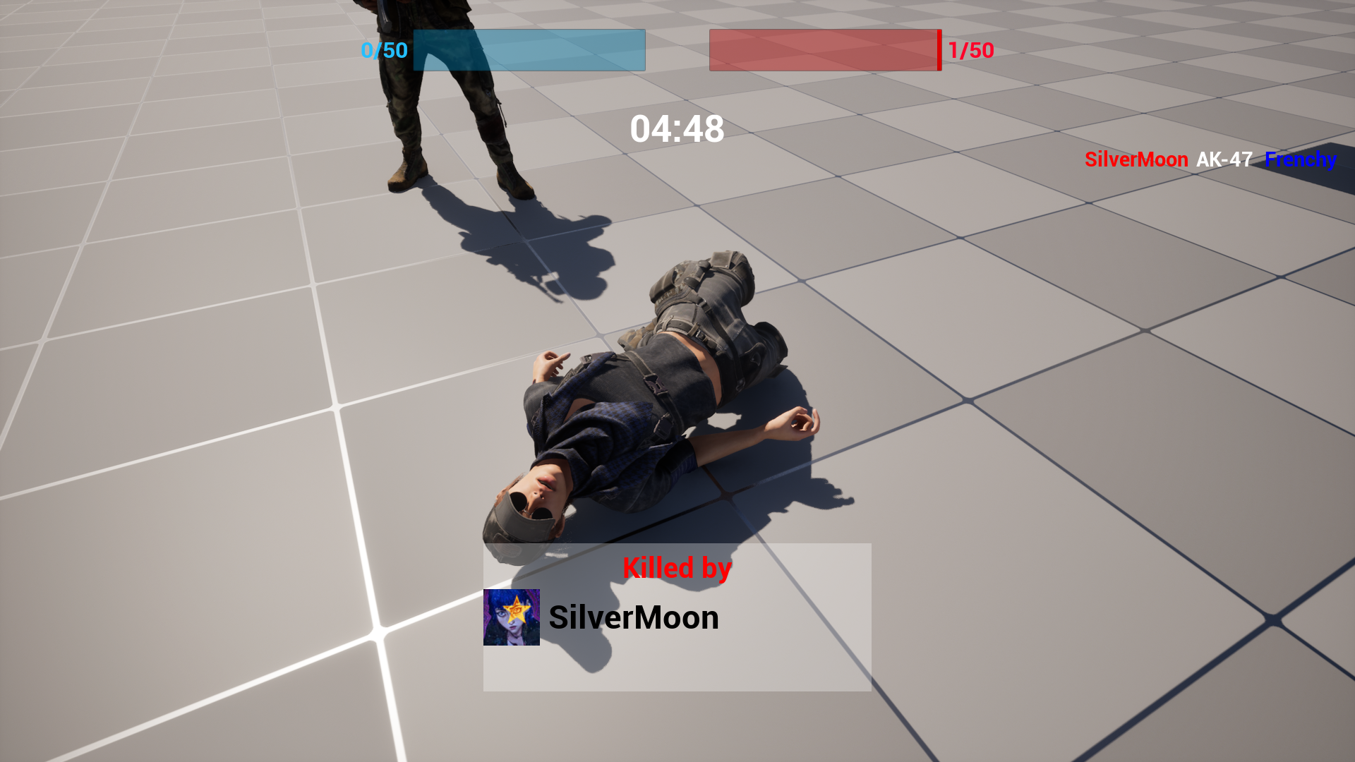 Death screen, showing the killfeed for everyone but also the death info for the killed player